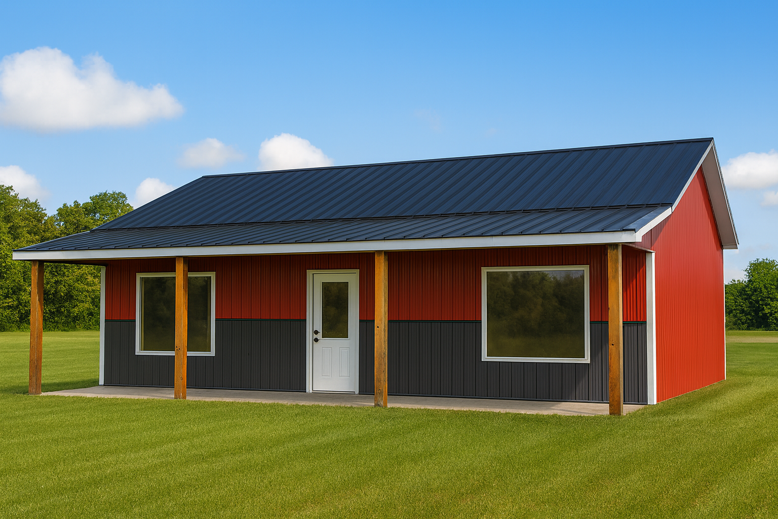 Includes (1) 3′ steel entry door with window/grids and 6 panel design, (2) 6×5 sliding windows, wainscot, 12″ enclosed overhangs, dripstop pre-applied to roof steel, insulation and drywall ready walls and ceiling, ridgevent, and includes engineered plans with delivery