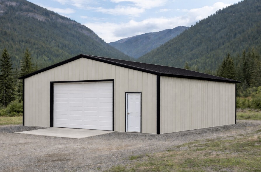 30x36x10 Pole Barn Kit with steel roof and steel siding. Includes 1 – 16×7 overhead door and 1 – 3′ entry door. (Harrow Model)