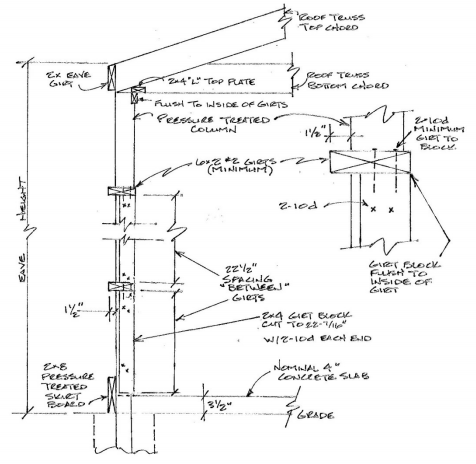 DEAR WILL: Congratulations upon considering post frame construction as your structural design solution. Sadly, most kit providers and builders are selling building shells based upon cheapest price, rather than meeting their client’s needs. With this low price, most often comes what is known as externally mounted wall girts – wall framing to support siding being attached wide face to wind on outside of columns. While this is quick, easy and takes little thought, it rarely meets Building Code requirements for meeting deflection criteria. There is a way to solve wall framing to be a one step process – bookshelf wall girts every 24 inches. This creates a very stiff wall structurally, provides an insulation cavity and requires no extra framing to add interior finishes.