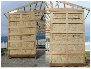 These photos are of the front endwall of a Hansen building. The areas where the OSB (Oriented Strand Board) are visible are shearwalls. These are needed in order to carry the horizontal loads imposed on the building due to wind from the roof to the ground. In most cases, the steel siding is adequate to carry these loads. In this particular case, a large endwall door opening precludes this as a design solution.
